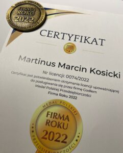 Mam zaszczyt poinformować Państwa o kolejnym sukcesie i wyróżnieniu jaki zdobyła firma Martinus Marcin Kosicki w konkursie Medal Polskiej Przedsiębiorczości – w kategorii: Firma Roku 2022.